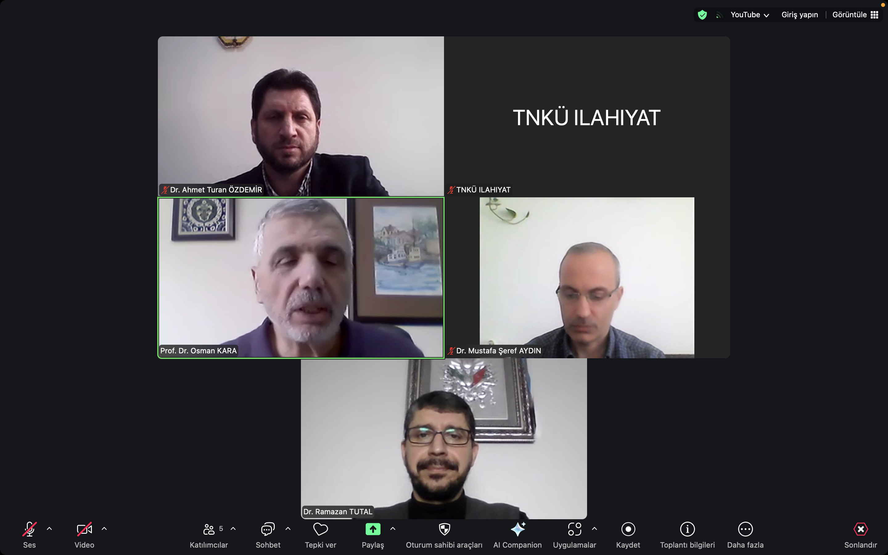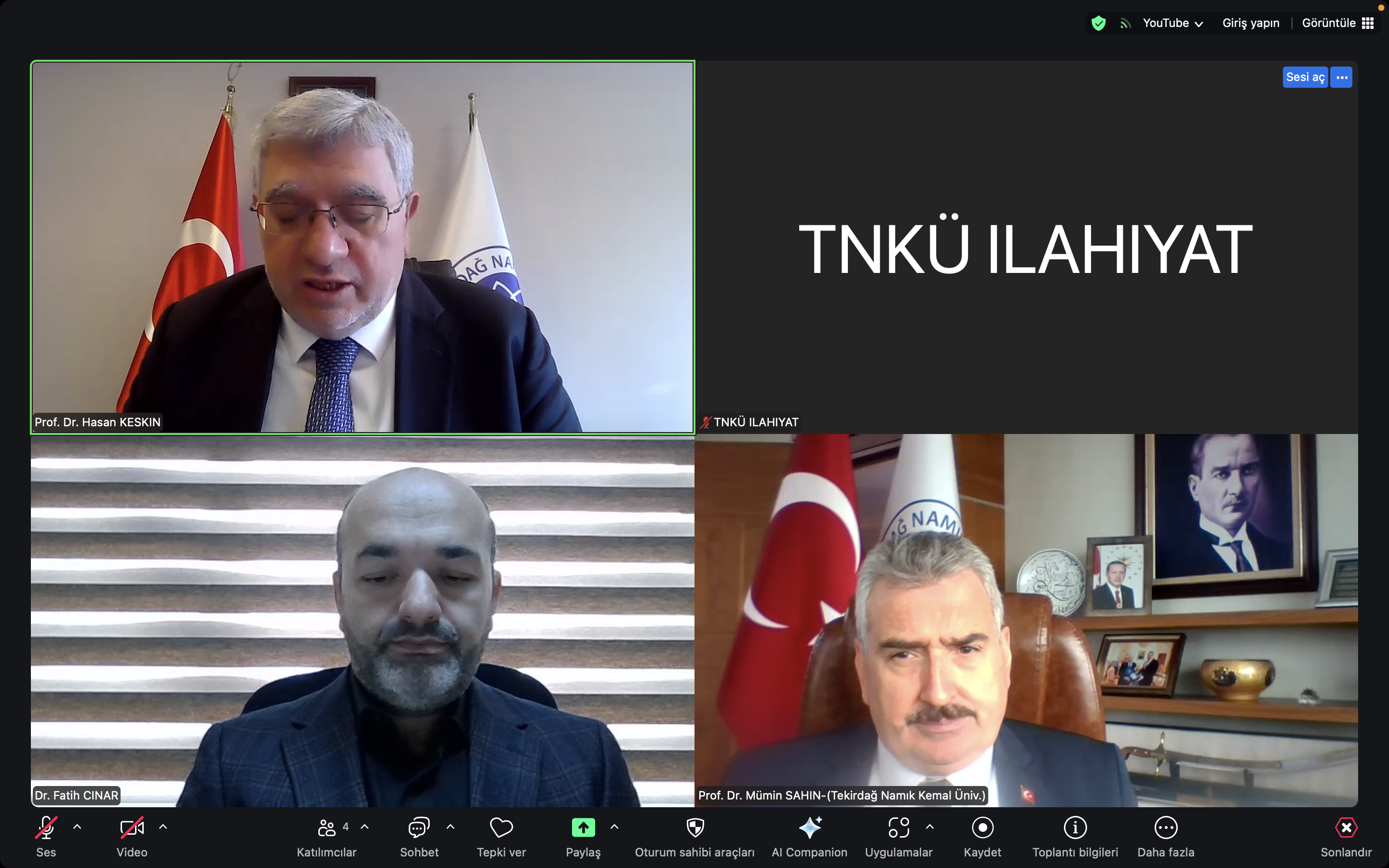 Çevrim içi olarak gerçekleşen sempozyumun açılış oturumuna Üniversitemiz Rektörü Prof. Dr. Mümin ŞAHİN ve İlahiyat Fakültemiz Dekanı Prof. Dr. Hasan KESKİN konuşmacı olarak katılarak birer açılış konuşması gerçekleştirdiler. İlahiyat Fakültemiz Öğretim Üyesi Dr. Fatih ÇINAR tarafından sunulan açılış oturumu, Fakültemiz Youtube kanalı TNKÜ İlahiyat TV’den de canlı olarak yayınlandı.